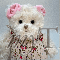 Eine sehr weiche Teddybär-Dame ist aus weissen, lockigen Plüsch gefertigt . Trägt ein Baumwollkleid mit Blümchen. Am Kopf hat sie zwei rosa Samt Schleife. Der Teddybär hat kindersichere Augen und ist bei 30 Grad C waschbar